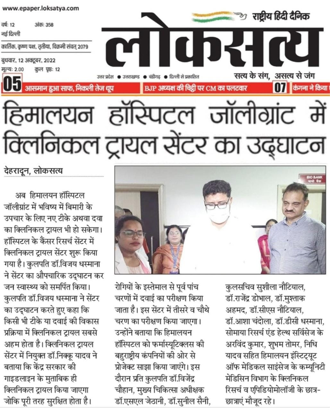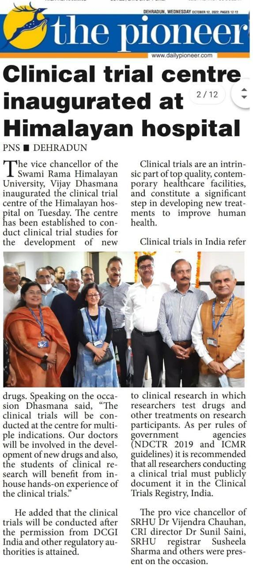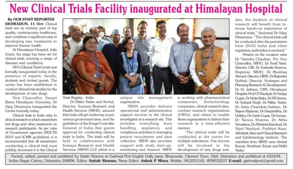 The Clinical Trial Centre has been established with the primary objective of conducting high-quality clinical research to support the development of new drugs on 11 October 2022. This initiative aims to contribute significantly to medical advancements by ensuring the safety and efficacy of new treatments before they reach the market. The inauguration ceremony was marked by a formal ribbon-cutting and Nariyal Fodne ritual, symbolizing new beginnings and success. The event was graced by the Honourable Vice Chancellor of SRHU, Dr Vijay Dhasmana, along with Dr Rajendra Dobhal, Director, Strategies Planning, Research & Development, SRHU, emphasizing the institution’s commitment to fostering research excellence in clinical trials. Clinical trials in India involve systematic testing of new drugs, therapies, and medical interventions on human participants to evaluate their safety, efficacy, and potential side effects. These trials are conducted under strict regulatory frameworks, including the New Drugs and Clinical Trials Rules (NDCTR) 2019, Indian Council of Medical Research (ICMR) Guidelines, and Drugs Controller General of India (DCGI) regulations. As per government mandates, all clinical trials must be registered in the Clinical Trials Registry - India (CTRI) before initiation, ensuring transparency and adherence to ethical research standards. Dr Nikku Yadav assured that all clinical trials conducted at the center will strictly comply with national and international regulatory requirements. No study will proceed without obtaining necessary approvals from DCGI and oversight from an independent Institutional Ethics Committee (IEC) to uphold ethical standards. To enhance the efficiency of clinical trial operations, the center has partnered with Somaya Research and Health Services (SRHS) LLP, a distinguished Site Management Organization (SMO), as well as KV Clinical Research, Chhattisgarh, to expand research capabilities and ensure streamlined operations. These partnerships will facilitate patient recruitment, regulatory compliance, and data management while strengthening multi-center clinical trials across different locations. The center will conduct clinical trials for multiple therapeutic indications, including cardiovascular diseases, metabolic disorders such as diabetes and PCOS, neurological disorders like Alzheimer’s and epilepsy, infectious diseases, oncology, and rare/orphan diseases. Our team of experienced clinicians and researchers will actively contribute to drug development, bringing new treatments closer to clinical application.